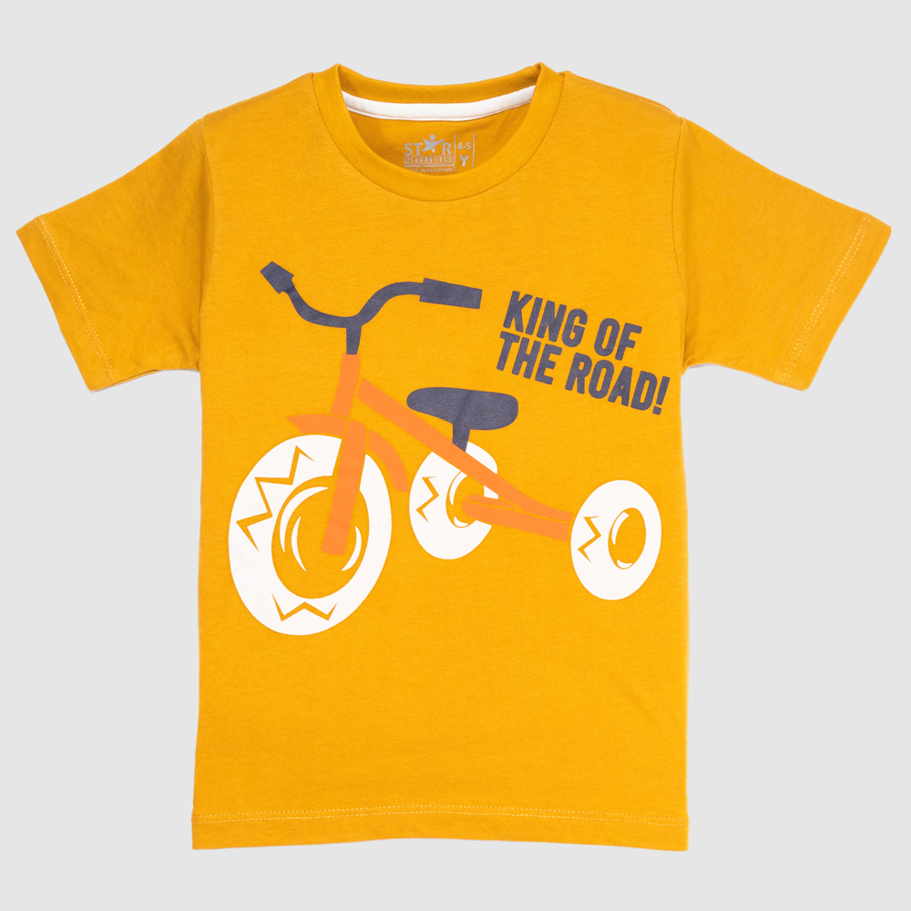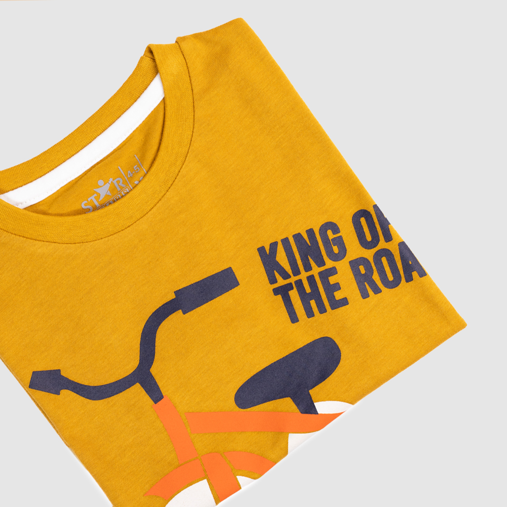 Ideal for daily wear, casual outings, or weekend playdates, this t-shirt offers the perfect mix of comfort, style, and attitude. The bright mustard color adds a cheerful touch, while the striking bike print ignites the imagination of young riders.