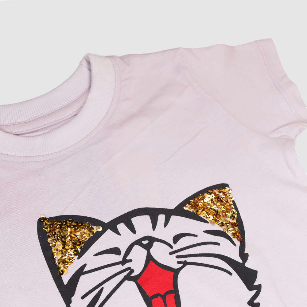 Make your little one shine with this Cute Pink Kitty Graphic T-Shirt for Girls, designed to add fun and sparkle to everyday outfits. Crafted from soft, breathable cotton, this short-sleeve tee features a cheerful cartoon kitty print with glittery gold sequin ears that girls will love. The round neckline and stretchable fabric ensure comfort all day long, whether at playdates, school, or home.