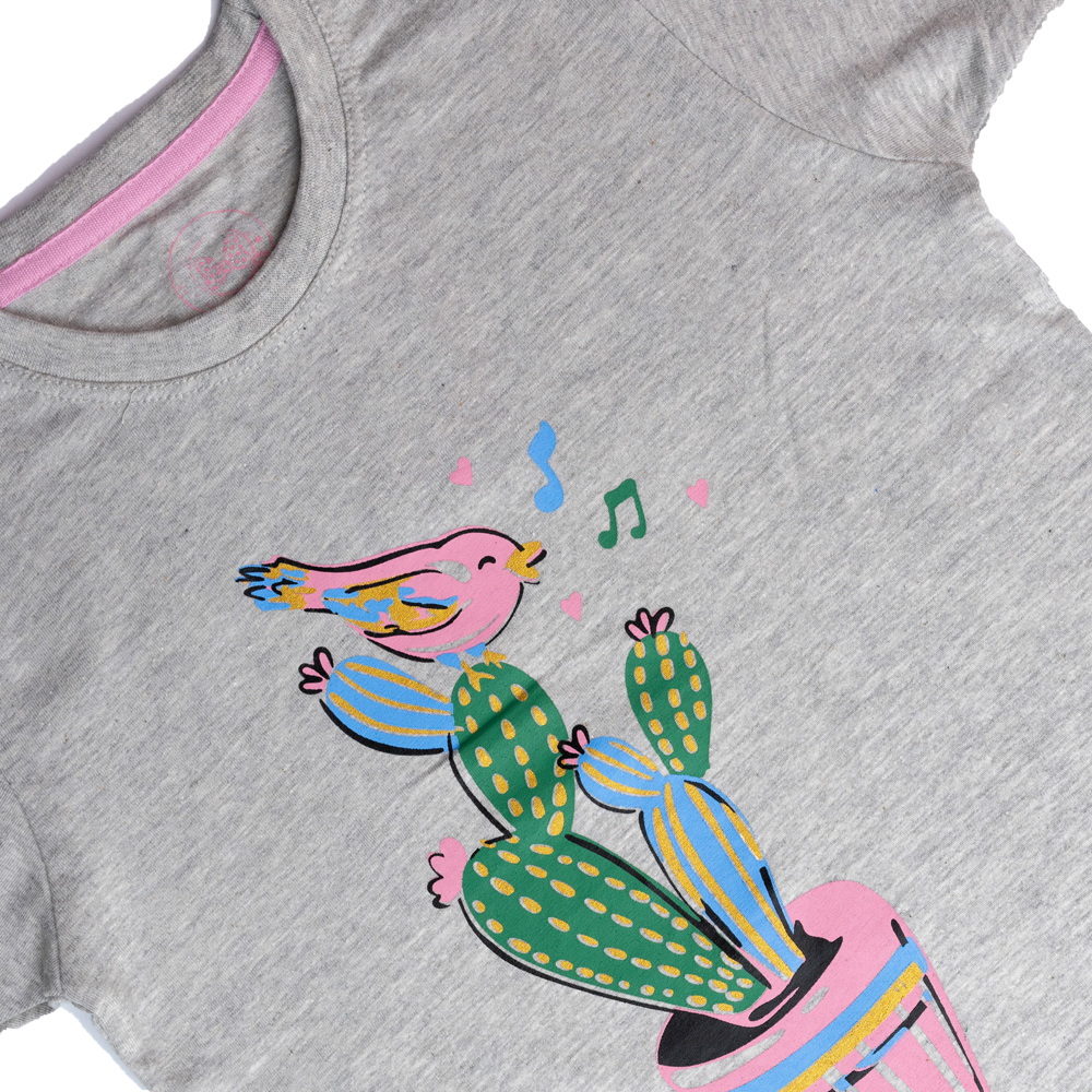Kids Grey Cactus & Singing Bird T-Shirt – Soft Cotton Summer Tee
