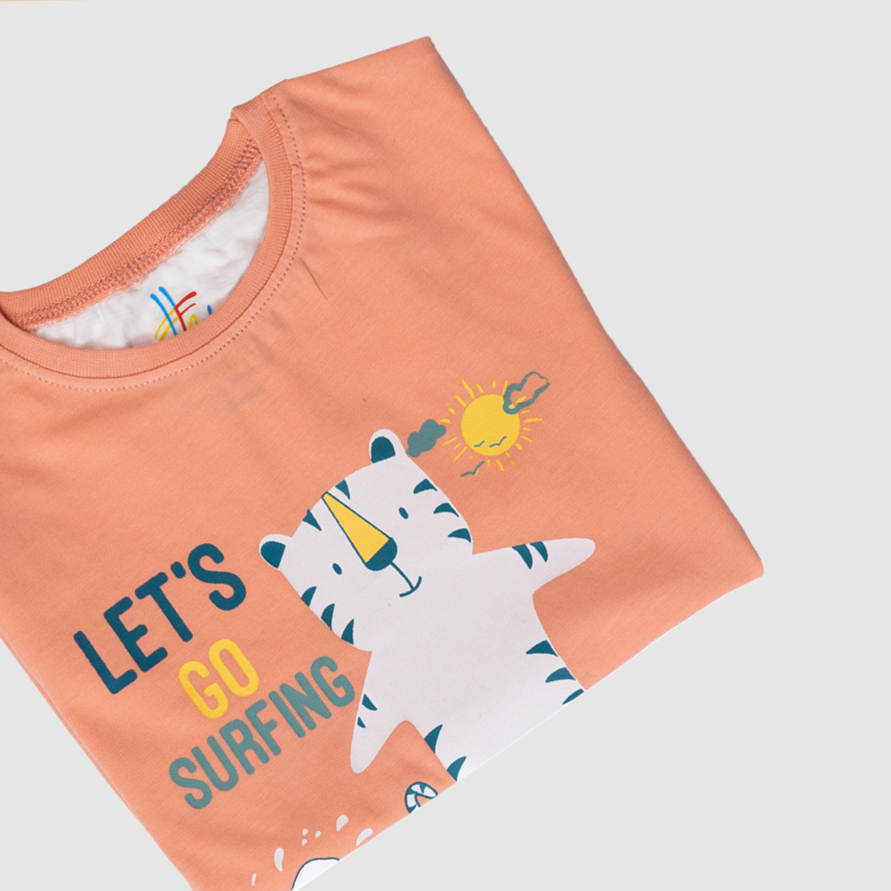 Get your little one ready for sunny beach days with this Kids’ Peach T-Shirt with Surfing Tiger Graphic and Summer Text. Made from soft and breathable cotton, this t-shirt features a charming cartoon tiger catching a wave on a surfboard under a bright sun, alongside the fun phrases “Let’s Go Surfing” and “Born to Go Surfing.”